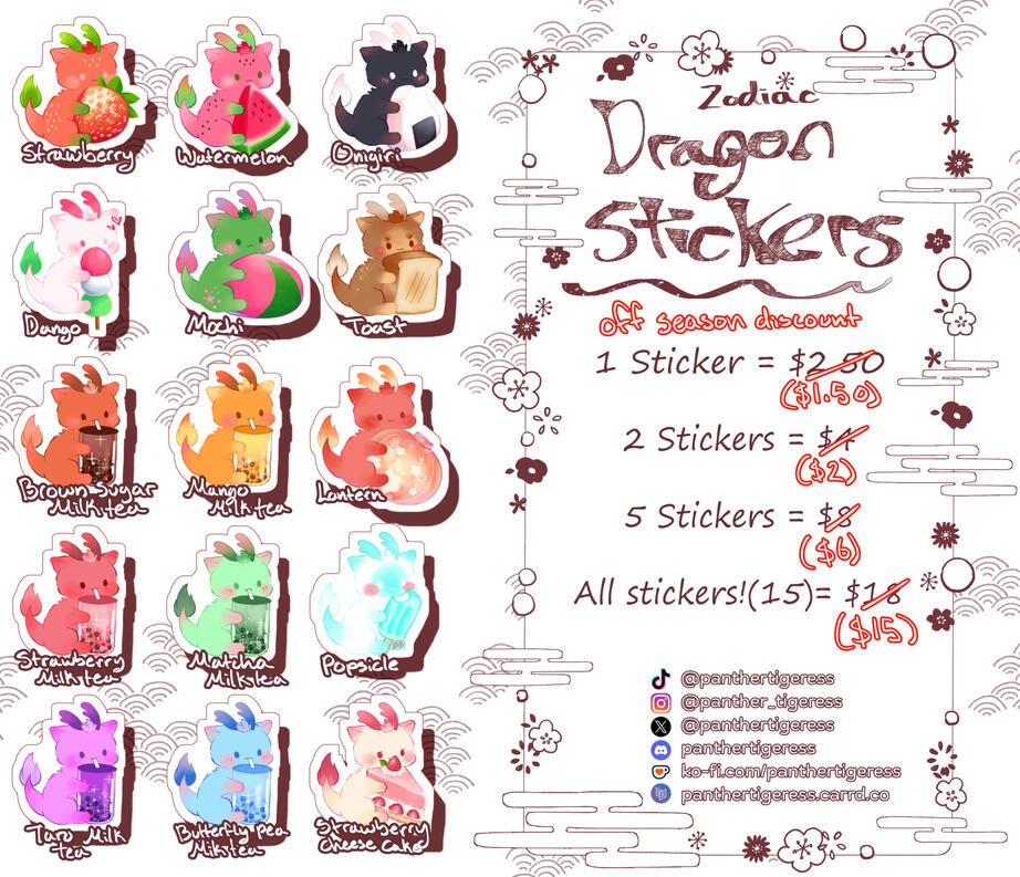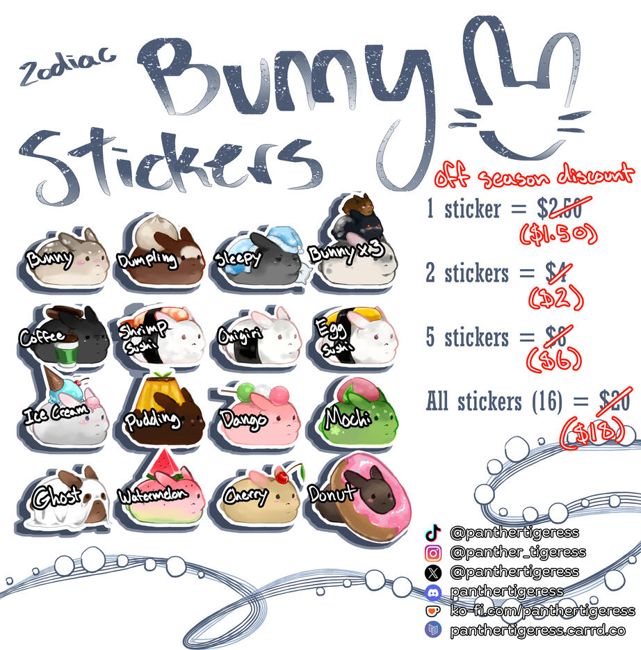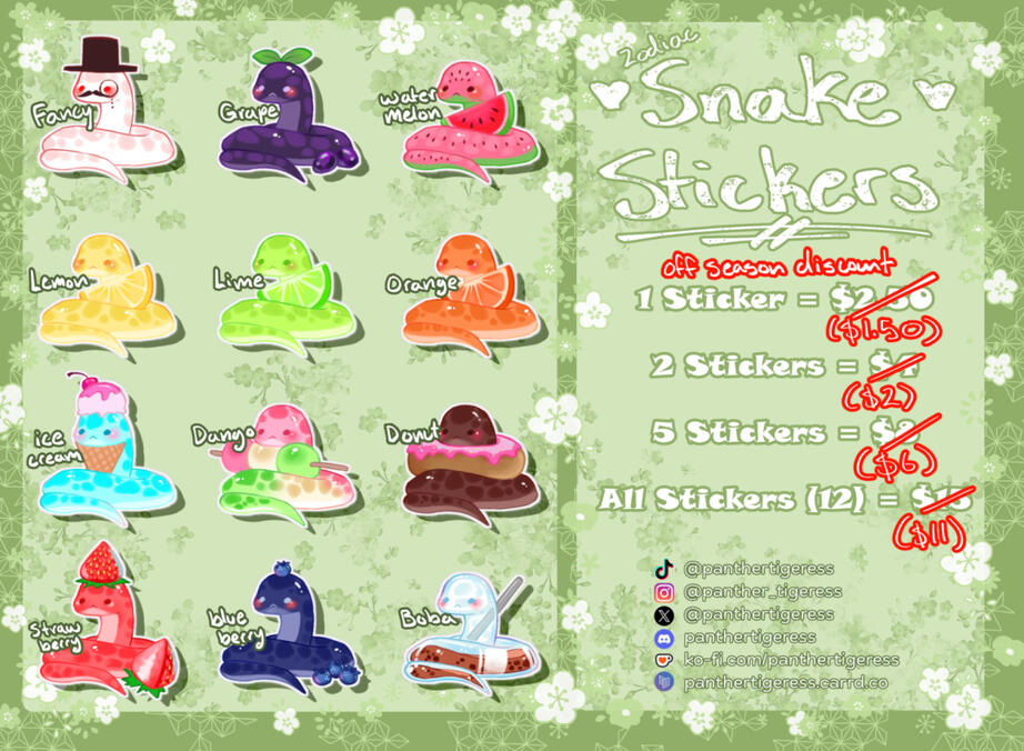 I only sell these stickers through KoFi, if you see my stickers being sold anywhere else, that is not my shop.These stickers are handmade, so there will be slight imperfections. Payment is through Stripe/Paypal in USD.Shipping fees are applied to the order. The prices listed in the reference images are without added fees.Buyers are required to contact me after purchasing a product to let me know which specific designs they would like (if the customer is not buying the set).